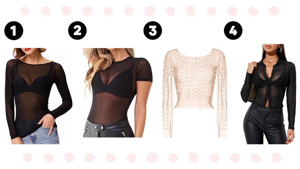 1.Sheer Long Sleeve 2. Sheer Crew Neck 3.Sheer with Pearls 4. Button Down