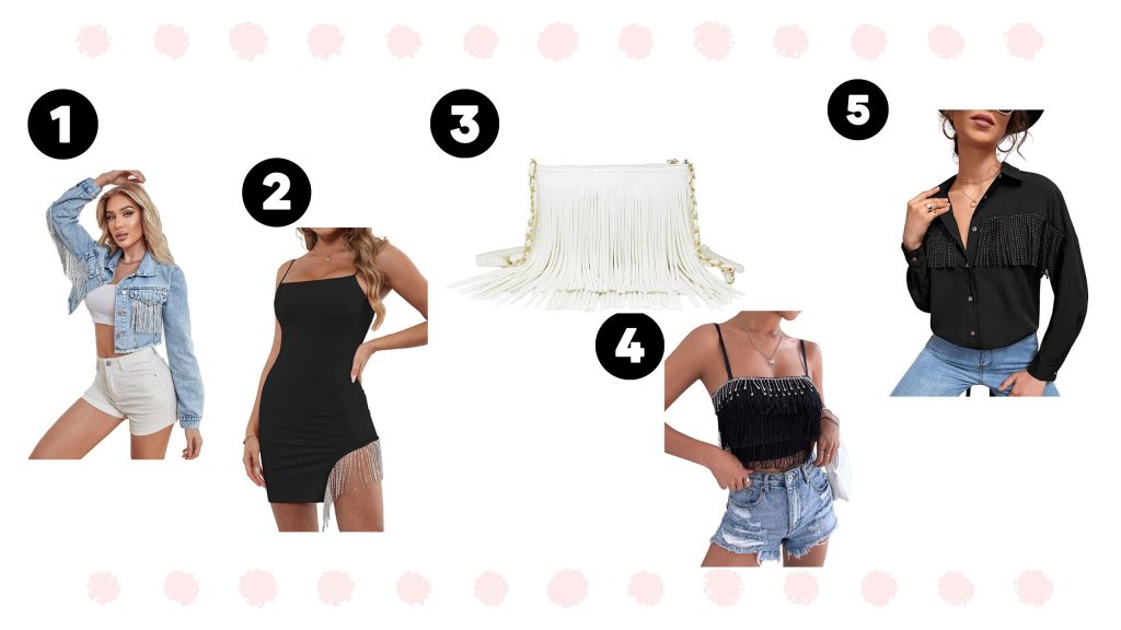 1.Fringe Jacket 2.Fringe Dress 3.Fringe Purse 4.Fringe Cami 5.Button Down